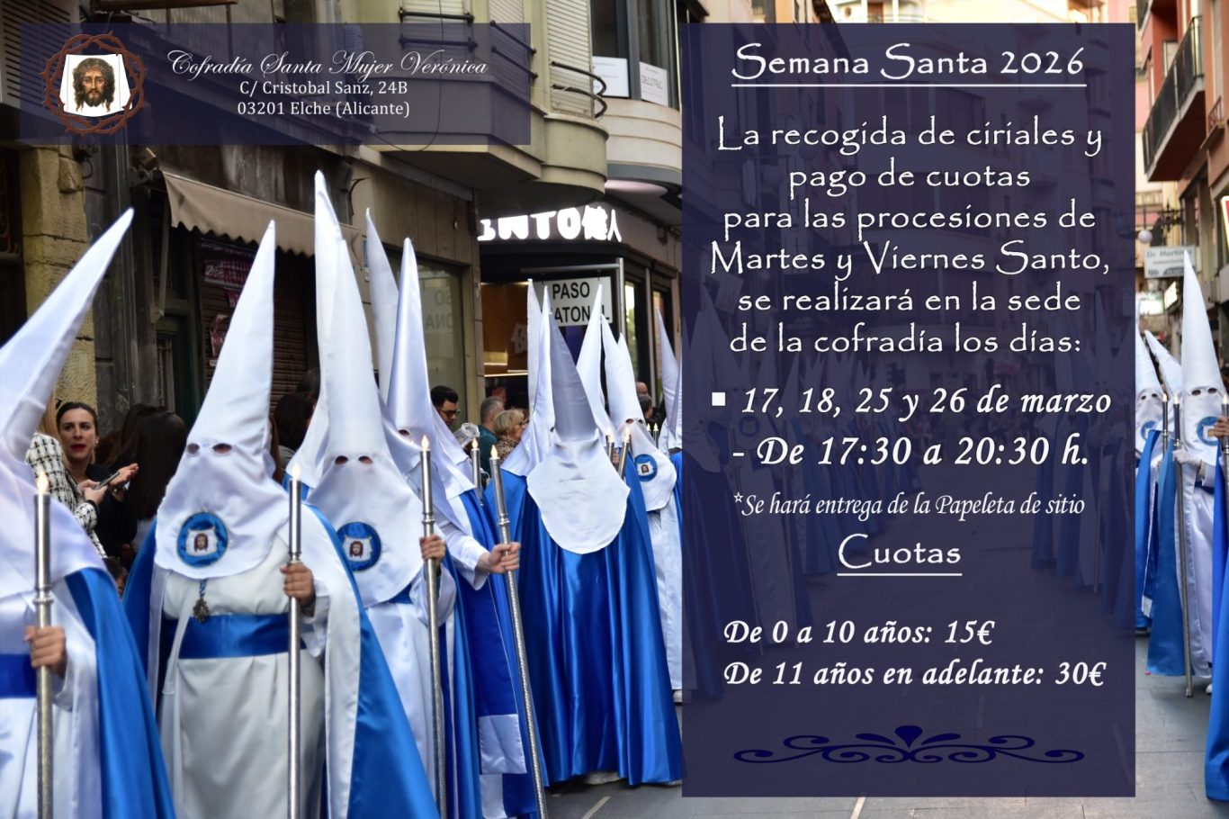 La recogida de ciriales y pago de cuotas para las procesiones de Martes y Viernes Santo, se realizará en la